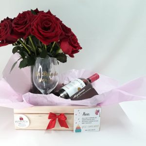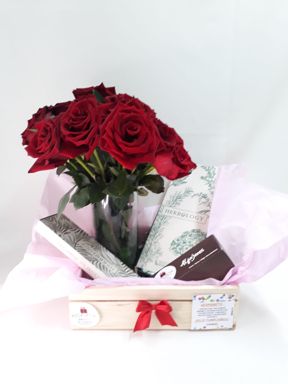 Hermosa Caja de regalo en madera, florero con 24 rosas, cojín herbal, y caja de alfajores x 5, antifaz, moño, papel seda y tarjeta personalizada.