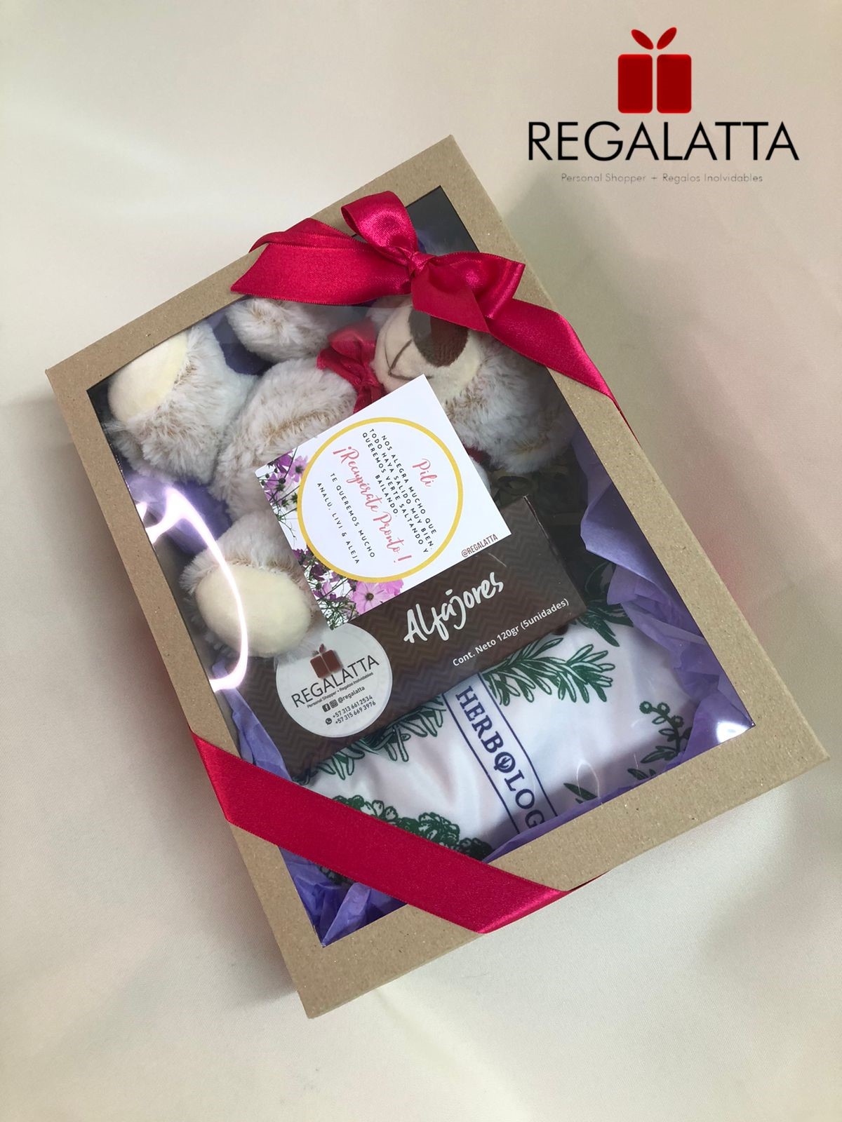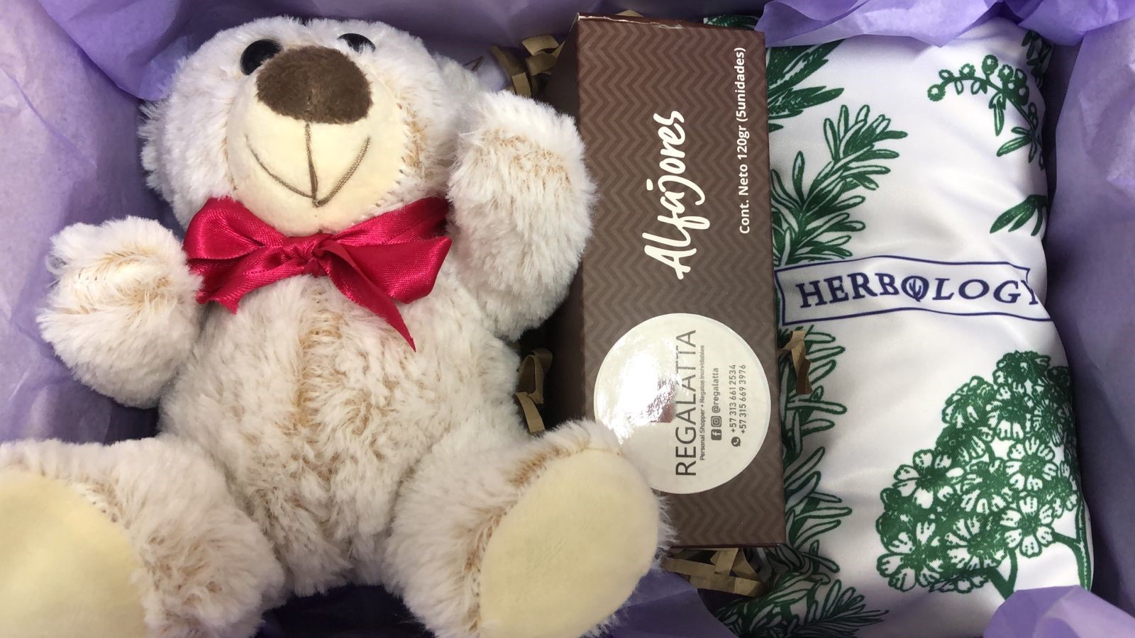 Hermosa caja de regalo decorada con cinta y tarjeta. En su interior: un osito de peluche de 20cm, caja x 5 deliciosos alfajores y un cojín herbal terapéutico para calor o frío, precio no incluye envío.