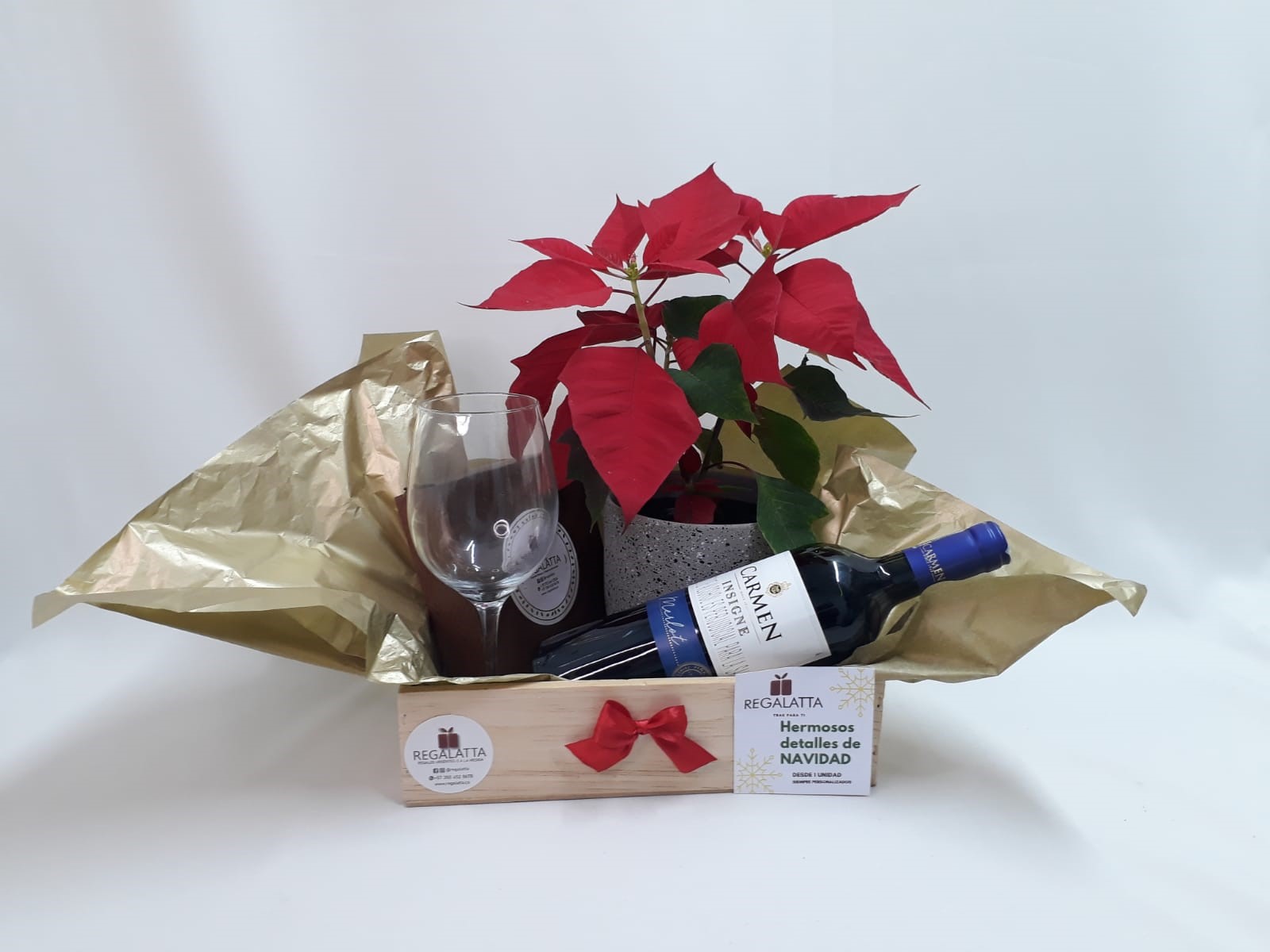 Hermoso regalo de navidad en Caja de madera, papel seda, moño de tela, tarjeta personalizada, planta de navidad, matera en cerámica, botella de vino, alfajores x 9 unid y una copa de cristal, valor del regalo no incluye el envío.