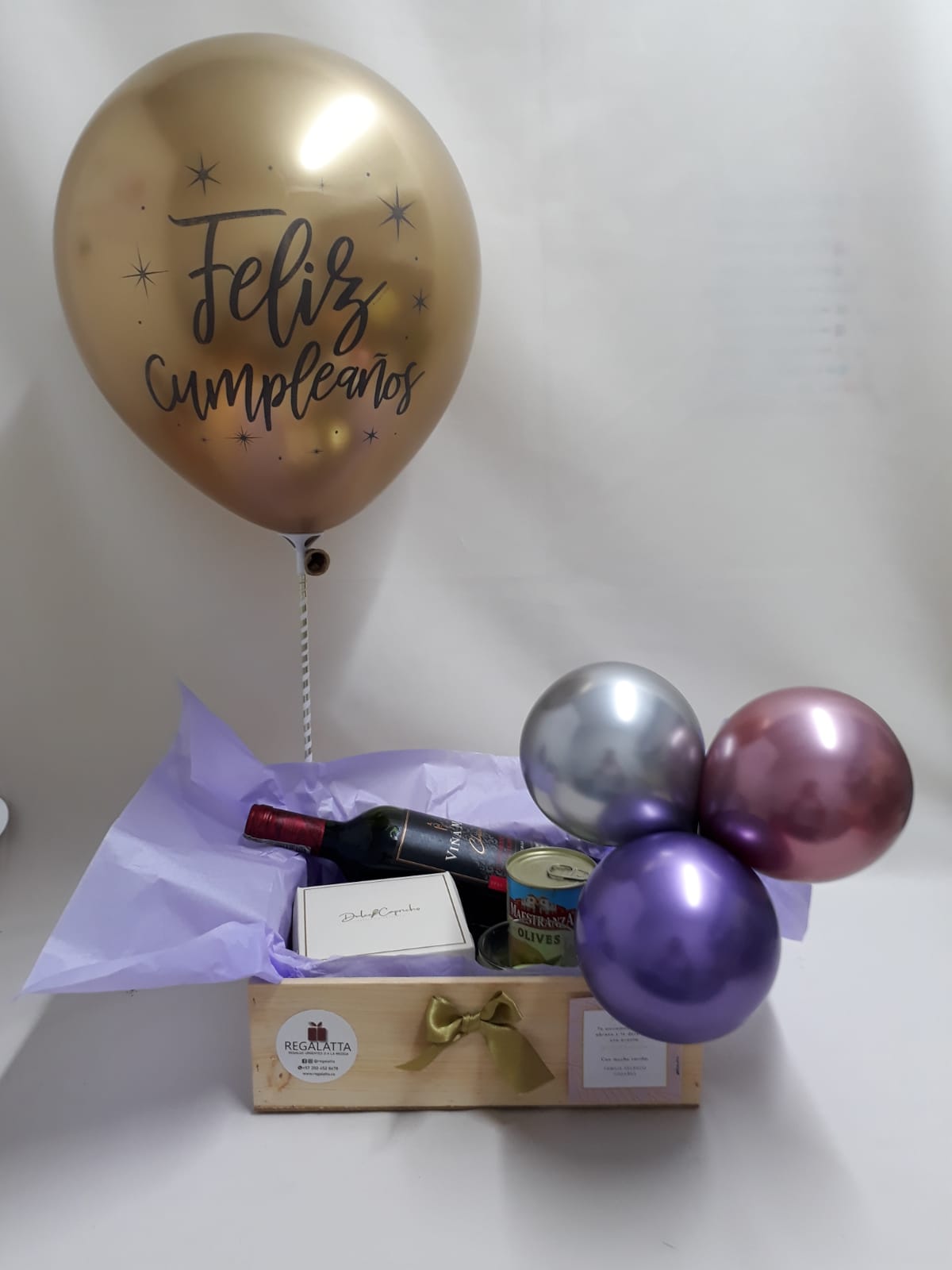 Dulce regalo en caja de madera que incluye, unos hermosos globos premium, exquisita torta de 4-6 pc de la Pastelería Dulce Capricho, vela pequeña en vaso de vidrio, aceitunas, botella de vino y tarjeta personalizada, precio no incluye envío.