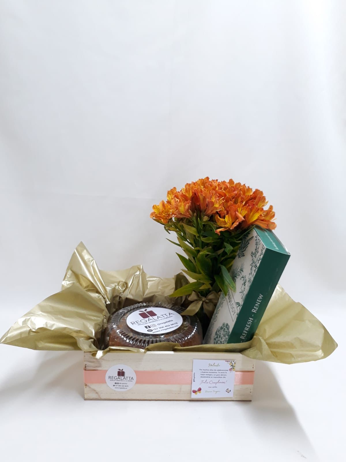 Hermoso regalo en caja de madera que incluye una deliciosa torta 3-5 pc, cojín herbal, hortensias x 4 unid y tarjeta personalizada, valor no incluye envío.