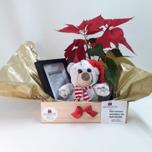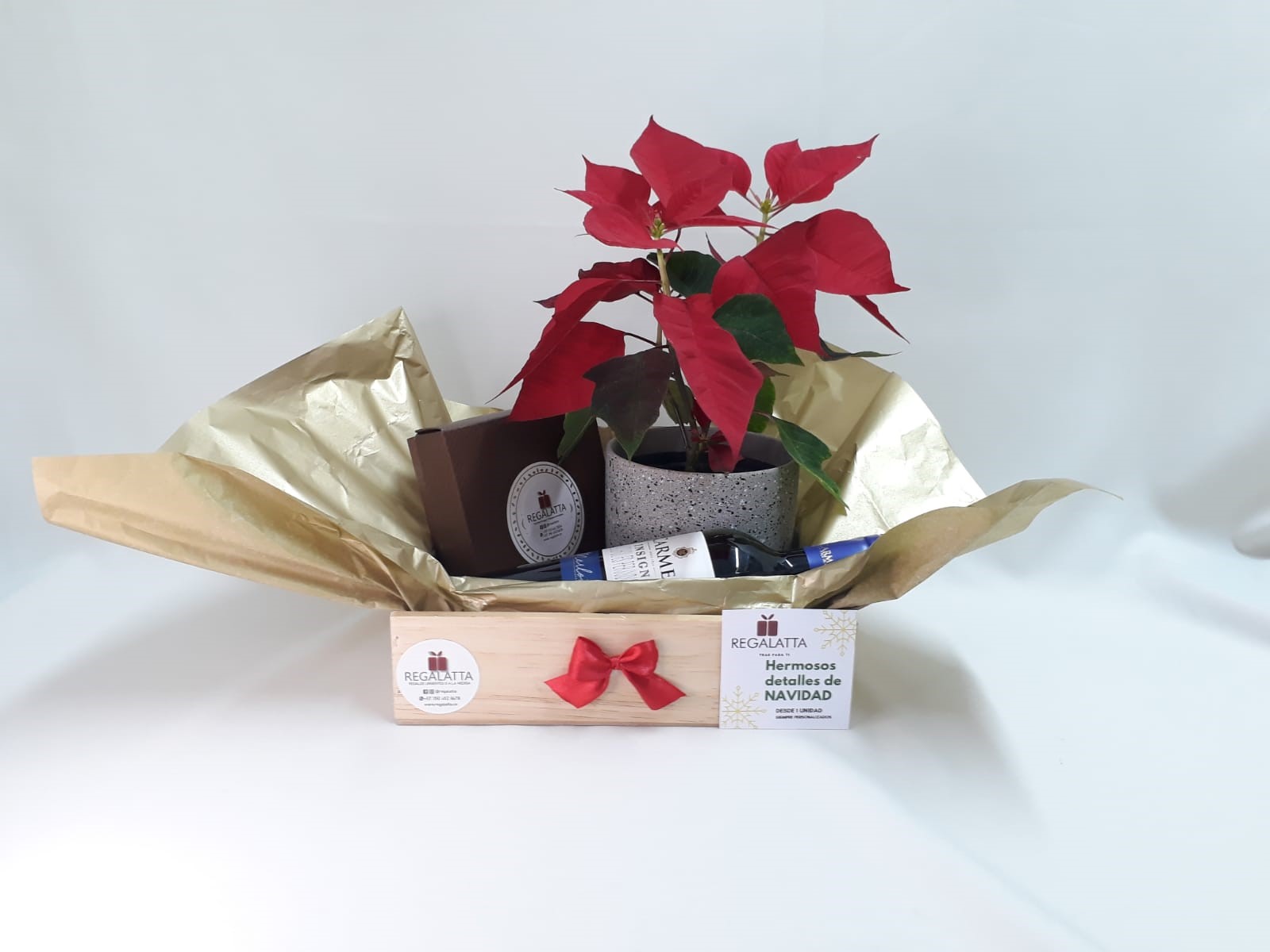 Hermoso regalo de navidad que va en Caja de madera, papel seda, moño de tela, tarjeta personalizada, planta de navidad, matera en cerámica, botella de vino, caja de alfajores x 9 unid, costo de regalo no incluye el envío.
