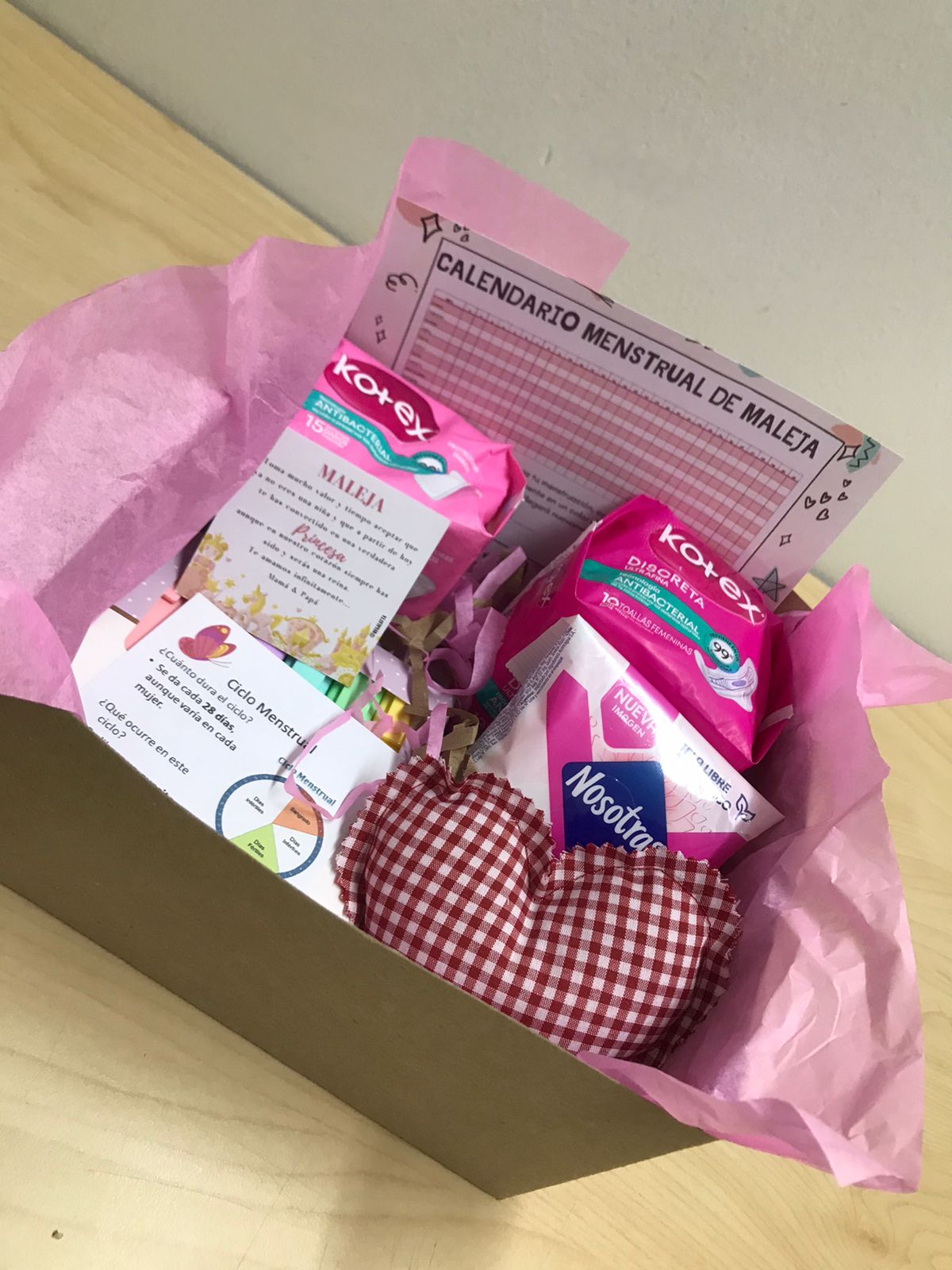 Paquete x 10 toallas higiénicas, paquete x 10 protectores diarios, calendario menstrual, tarjeta explicativa del ciclo menstrual, toallitas húmedas, almohadita roja (10cm diámetro), caja de cartón y tarjeta personalizada.