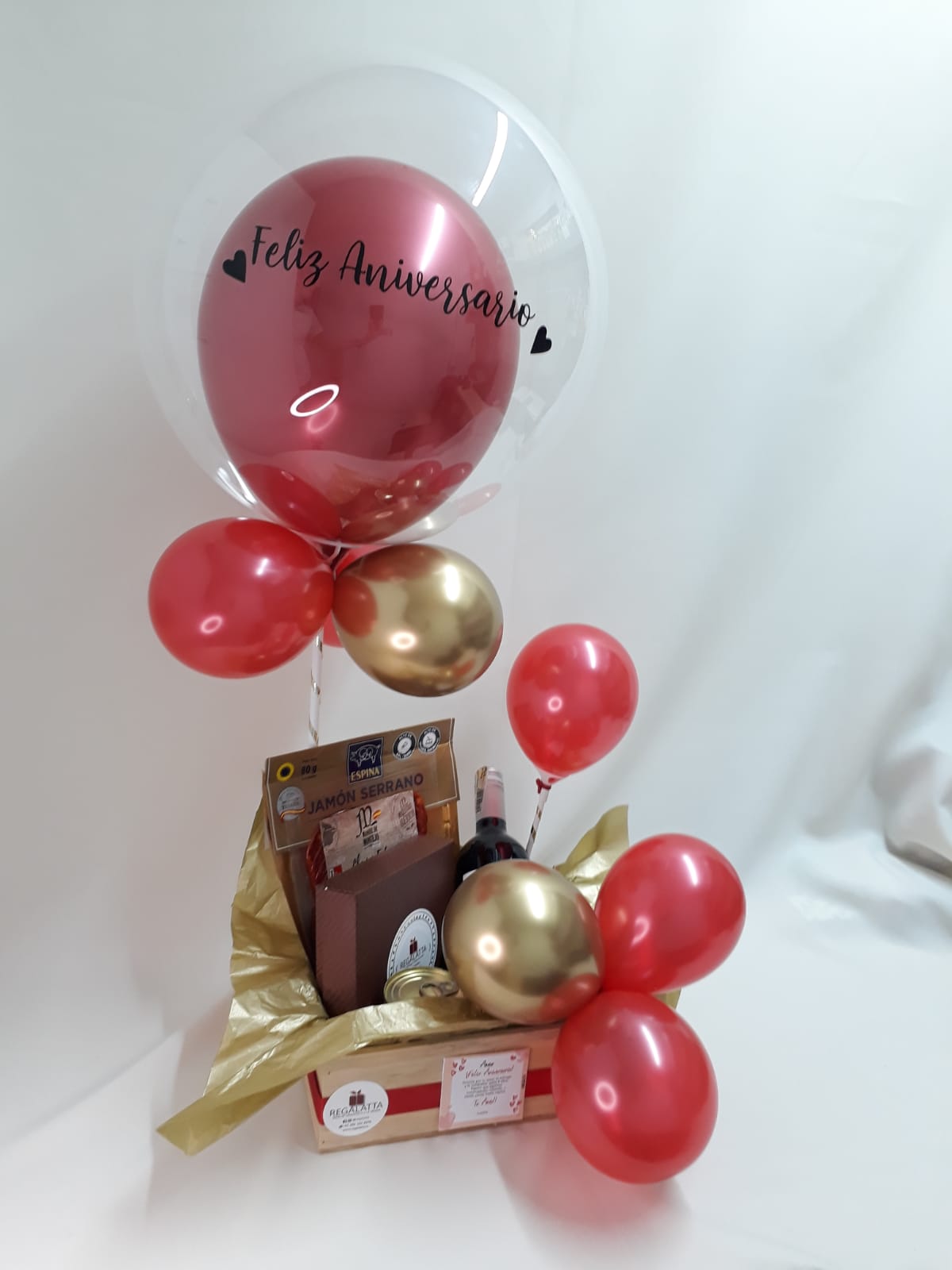 Vino tinto, caja x 9 alfajores, jamón serrano, chorizo español, aceitunas, en una hermosa caja de madera, papel, cinta, set de globos premium y tarjeta personalizada.