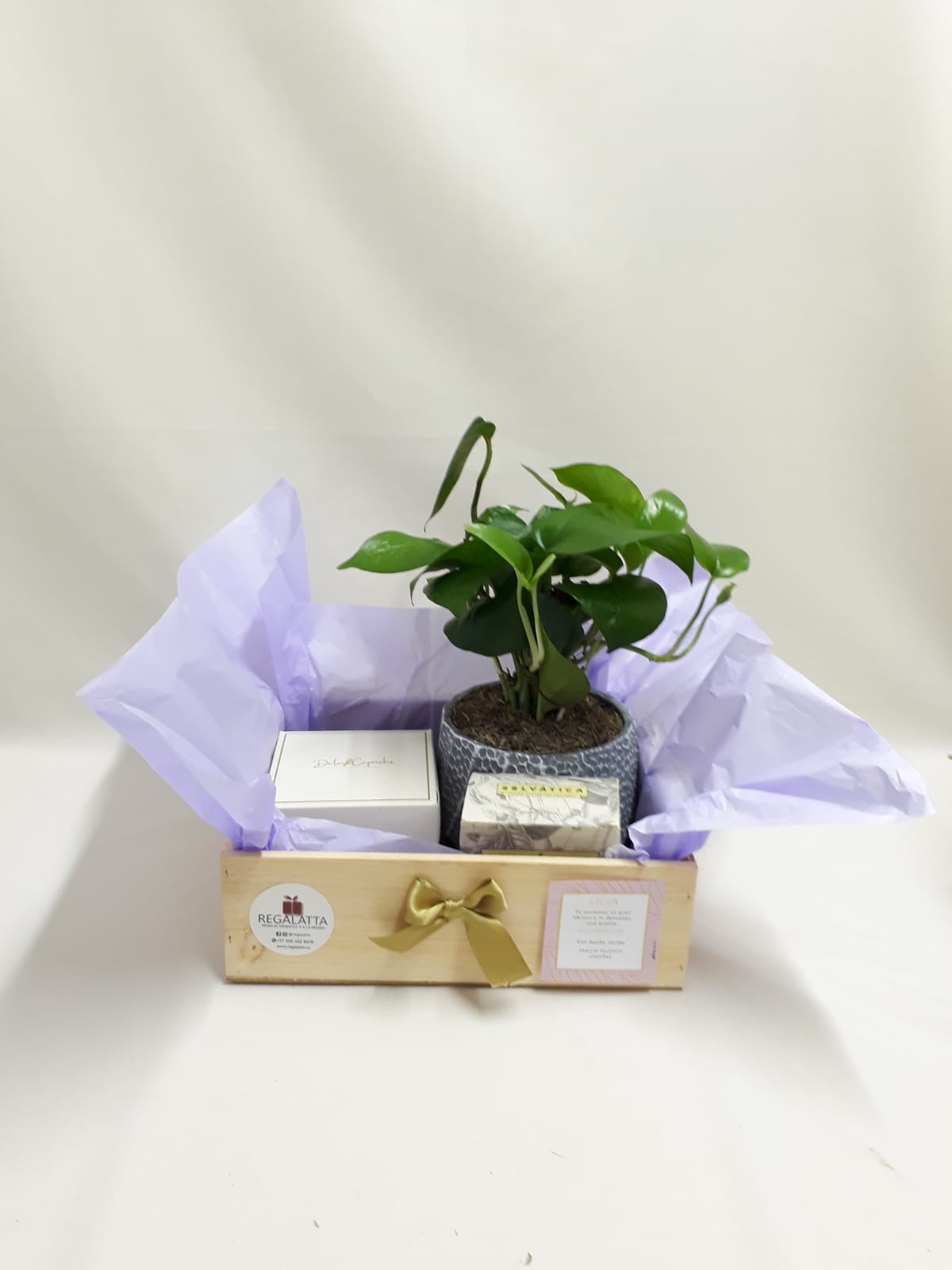 Deléitese con este natural y dulce regalo en caja de madera que incluye una hermosa Planta Miami en matera de cerámica, aromáticas surtidas del amazonas, exquisita torta de 4-6 pc de la Pastelería Dulce Capricho y tarjeta personalizada. precio no incluye envío.