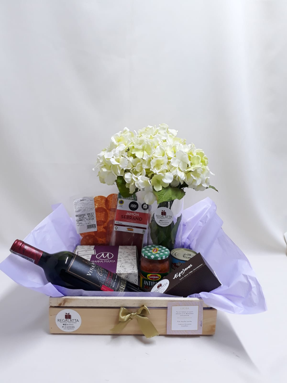 Deluxe detalle en Caja de madera que incluye botella de vino, alfajores x 5, torta x 5 pc de María María, antipasto, aceitunas, jamón serrano y chorizo español, jarrón de vidrio, 12 hortensias o la opción de 24 rosas y tarjeta personalizada