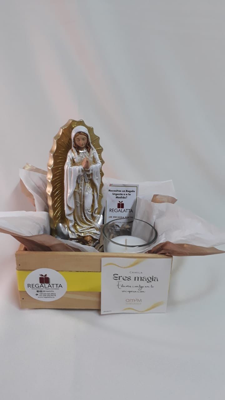 Cálido y espiritual regalo en una hermosa Caja de madera que contiene una virgen, vela pequeña en embace de vidrio, vinilo personalizado, cinta en tela y tarjeta personalizada, el precio del regalo no incluye el envío.