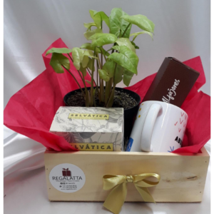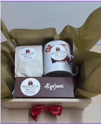 5 deliciosos Alfajores acompañados de café colombiano por 500g, con taza elaborada con el diseño que escojas en caja de madera.