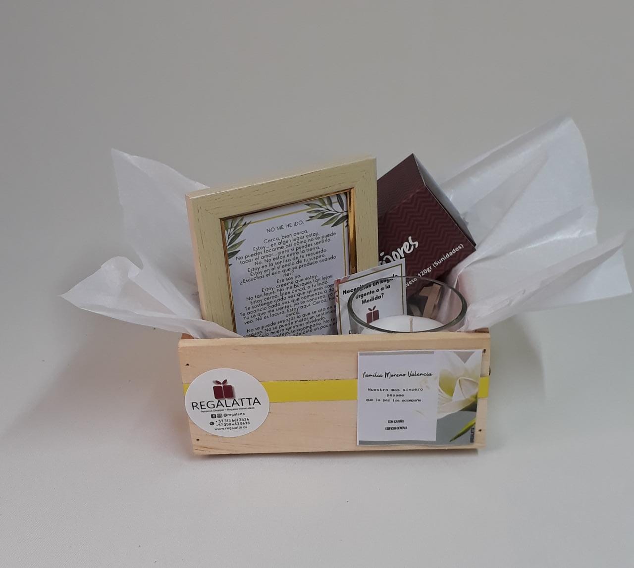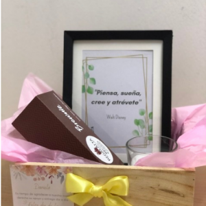 Hermoso portarretrato 9cmx13cm con mensaje según la ocasión, acompañado de una hermosa vela en envase de vidrio y una caja de 5 alfajores empacados en una delicada caja de cartón con cinta y tarjeta, precio del regalo no incluye el envío.