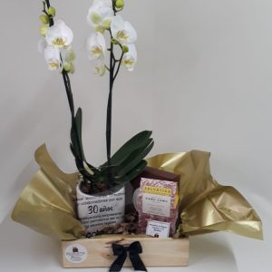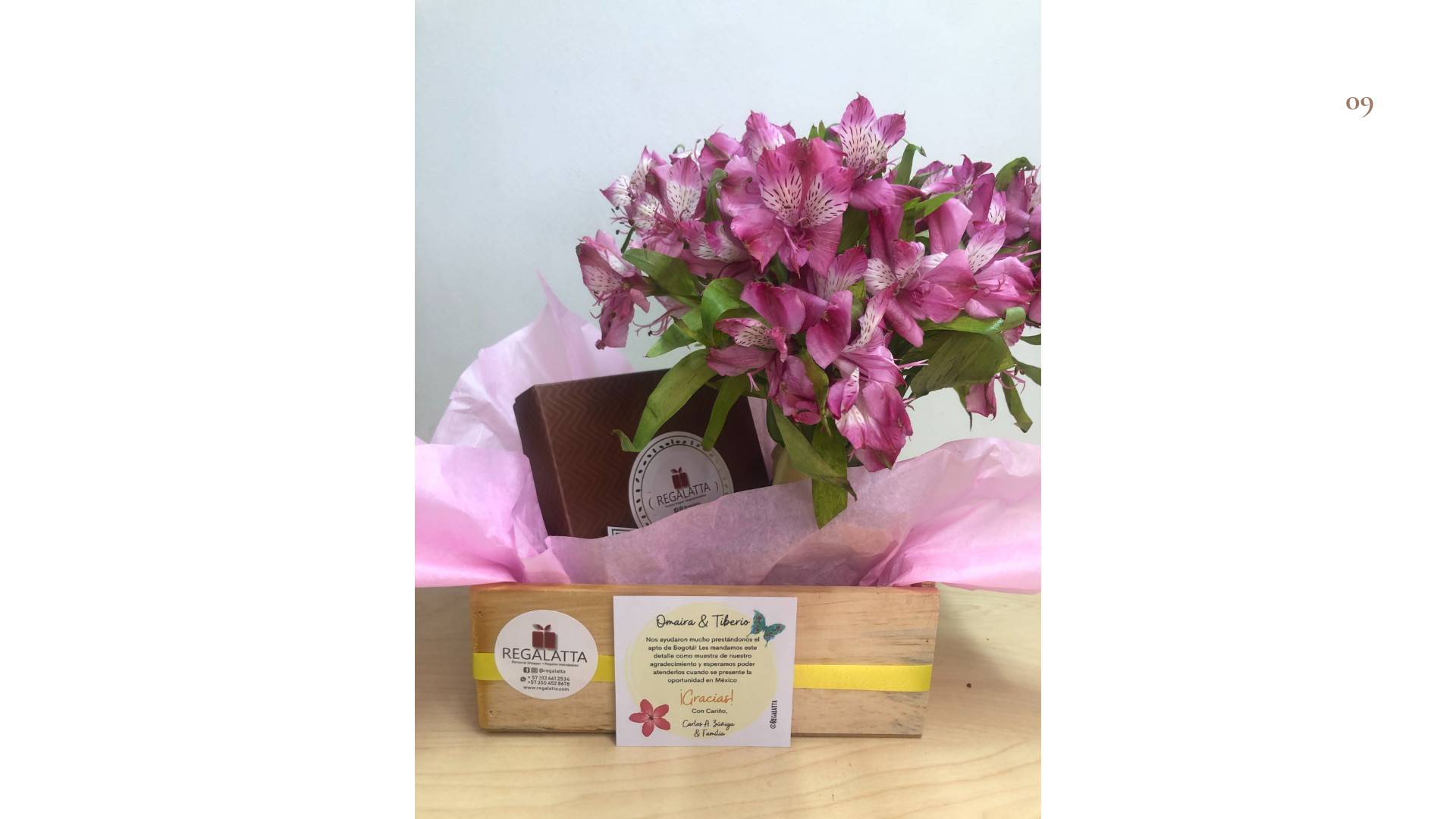 Caja x 9 alfajores o brownies, acompañada de Un pequeño arreglo de flores. Escoge tu Estilo de Decoración con o sin globos.