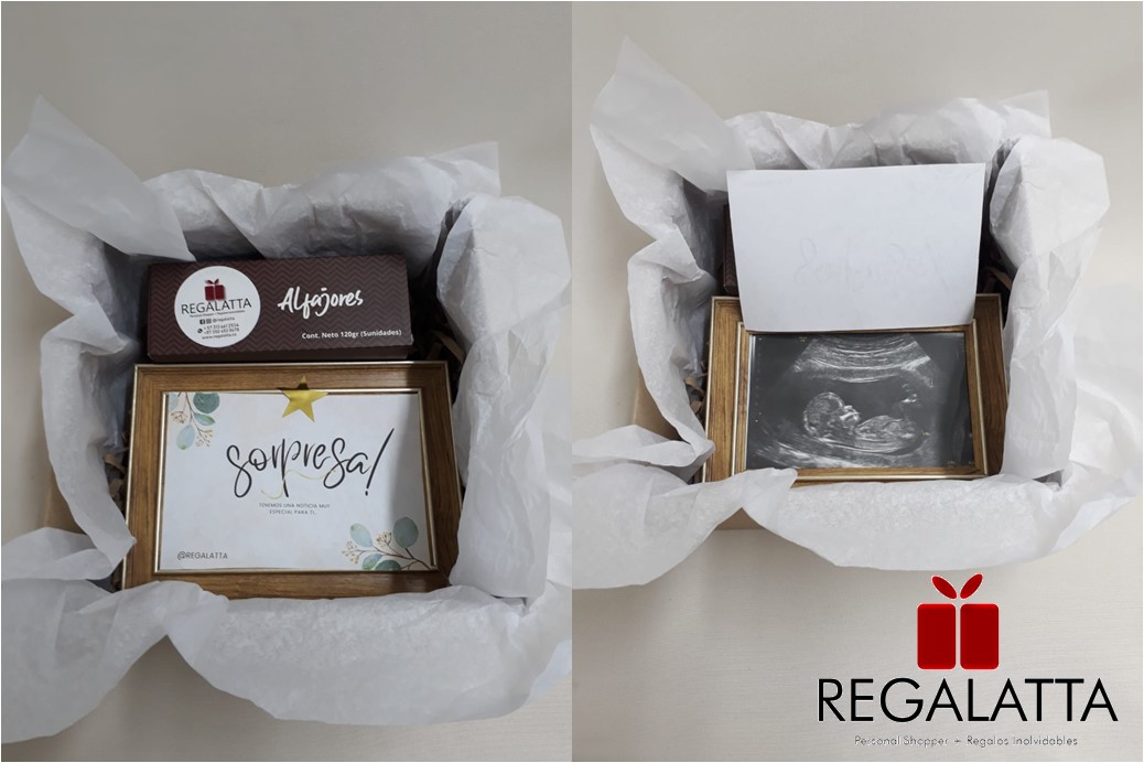 Regalo en caja de cartón 21×21, portarretrato de 10×15, tarjeta sorpresa, foto ecografía, tarjeta personalizada, cinta tela, moño y papel seda