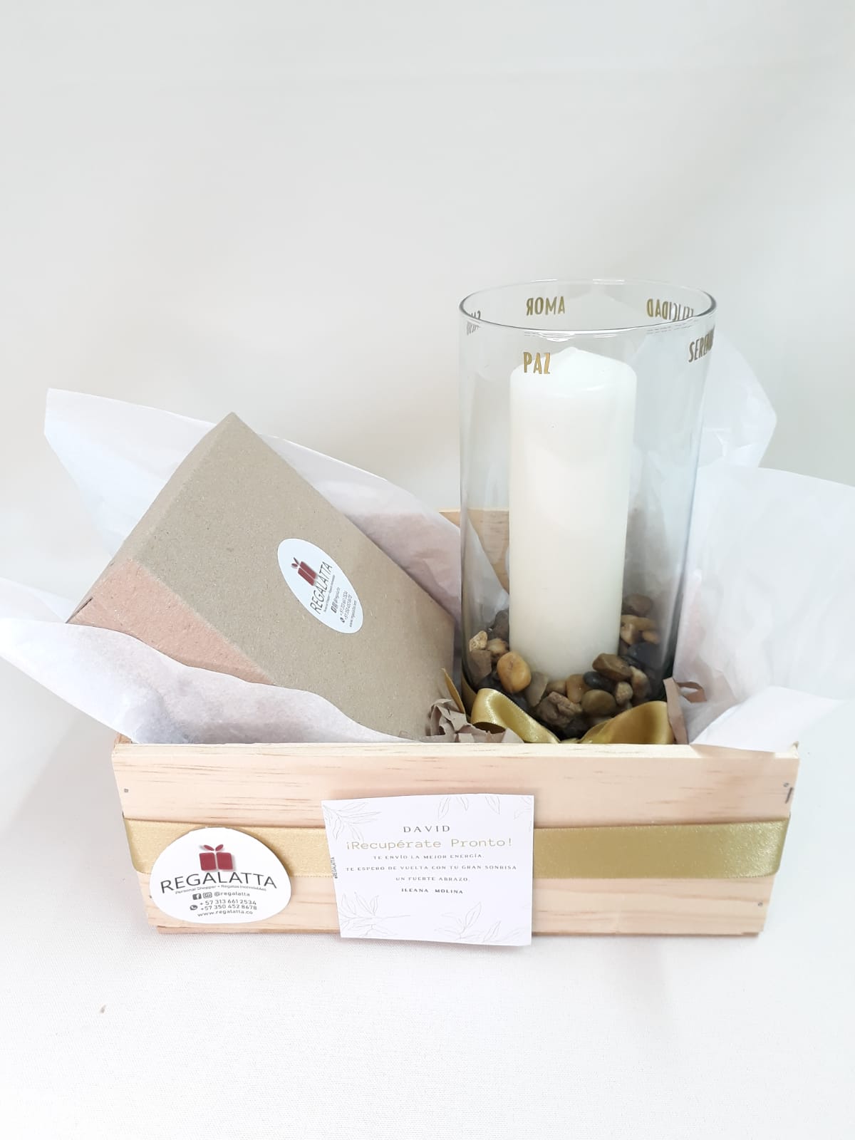 Deseos de salud, felicidad, serenidad, amor y paz  plasmados en un elegante candelabro en vidrio con letras en vinilo, velón blanco de 18cm de altura y piedras naturales, presentados en una hermosa y sobria caja de madera con cinta y tarjeta y acompañado de una caja de deliciosos alfajores artesanales por  9 unidades.