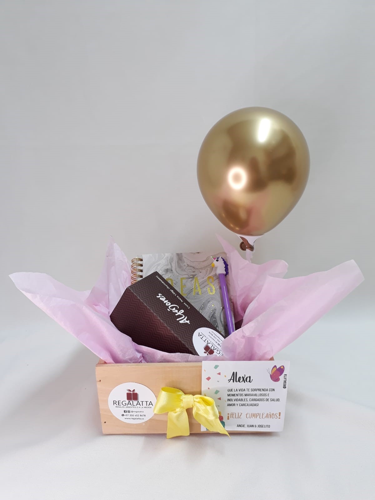Cuaderno pequeño argollado de 50 hojas, lapicero infantil o sobrio sencillo de tinta negra, caja x 5 alfajores, caja de madera, moño, globo pequeño premium y tarjeta personalizada, Valor del detalle no incluye envió.