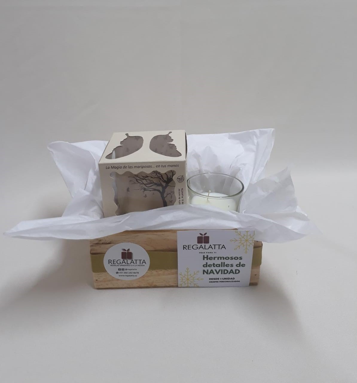 Hermosa vela en envase de vidrio acompañadas de una delicada pupa de mariposa.