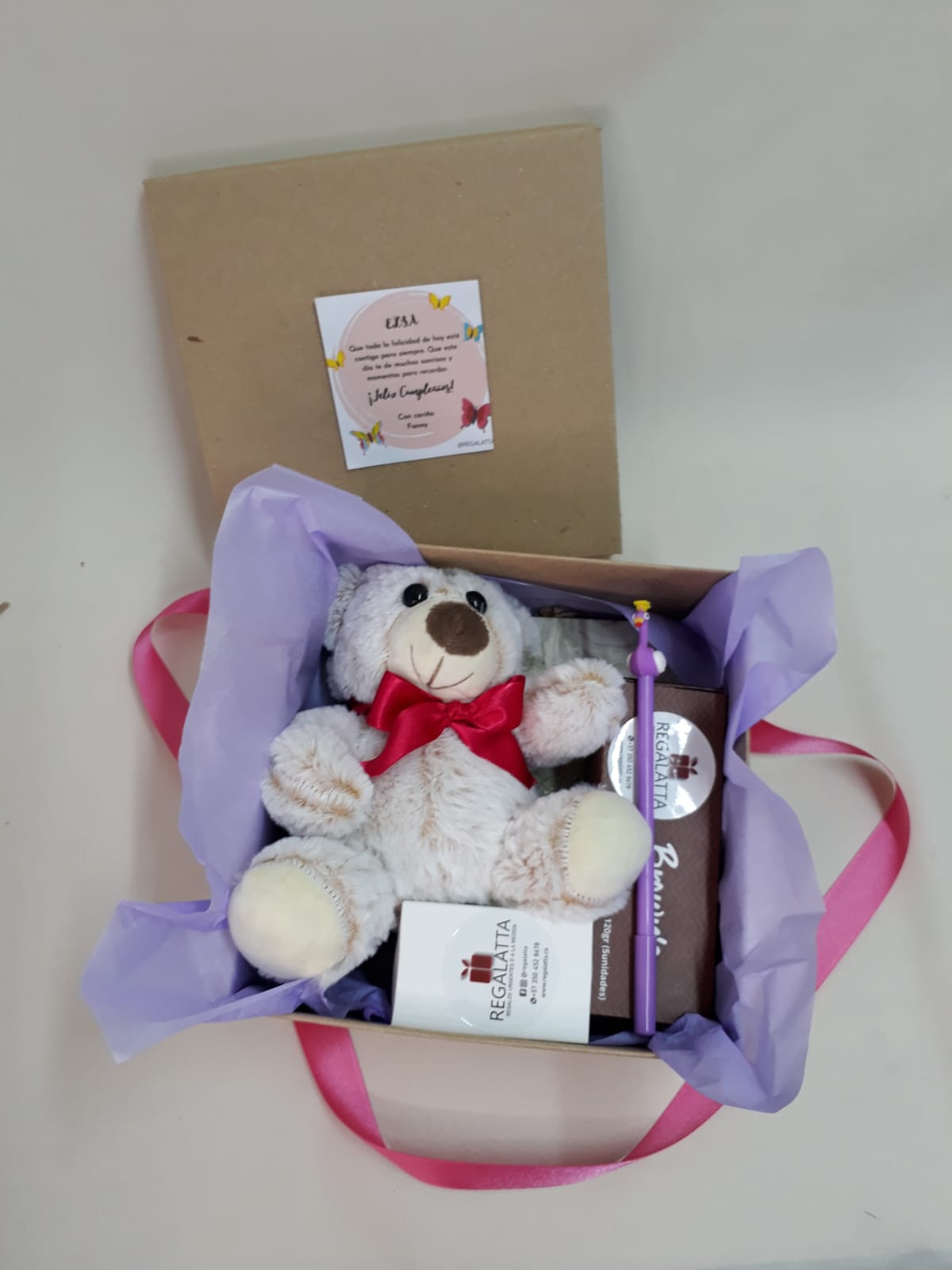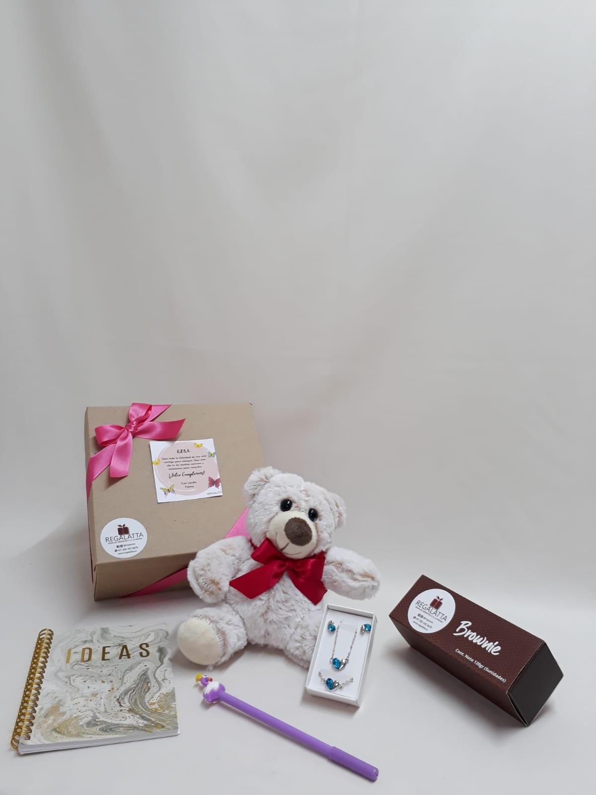 Tierno e inspirador regalo que viene en su caja kraft con un hermoso oso, alfajores x 5 und, set de cadenitas, lapicero, libreta y su tarjeta personalizada, valor no incluye el envío.