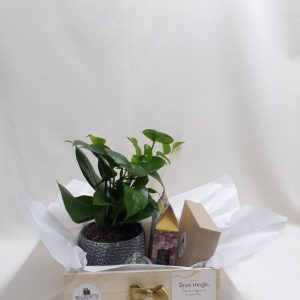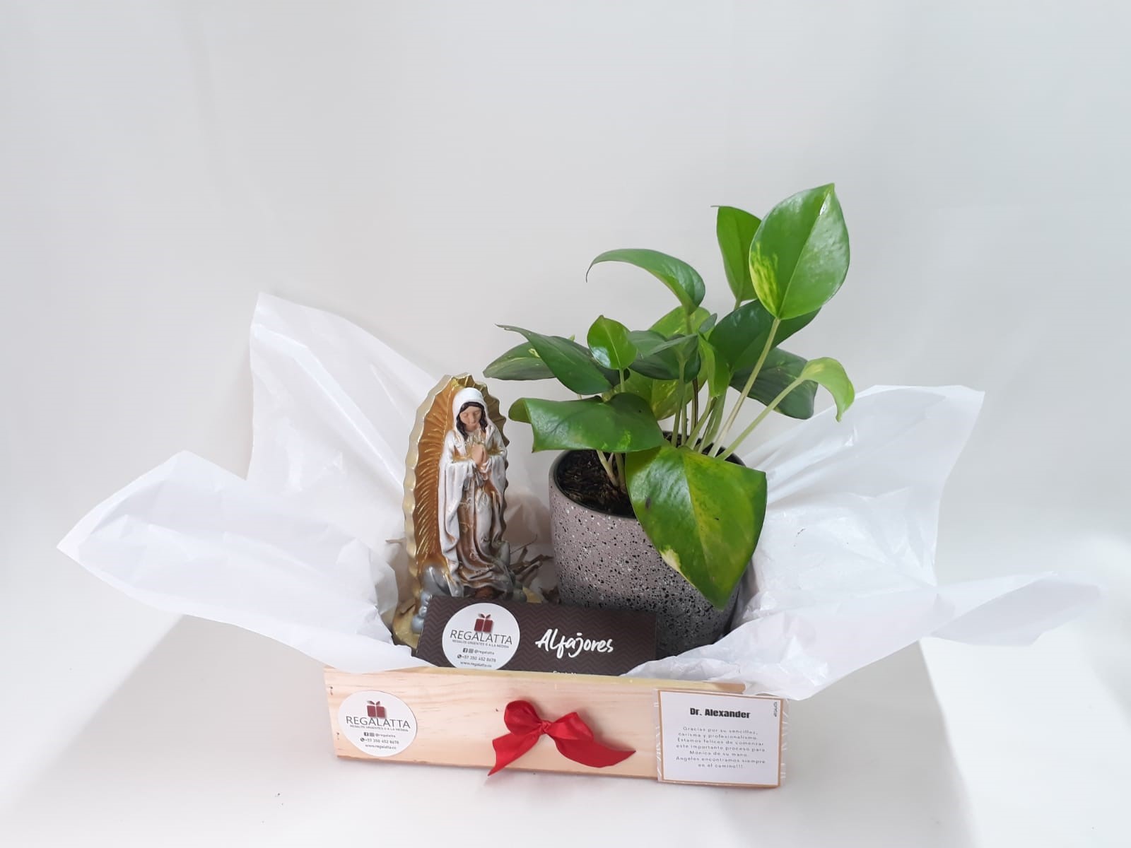 Devoto regalo en una hermosa Caja de madera, una virgen de Guadalupe (20cm) acompañada de una planta de interior en matera de cerámica caja de alfajores x 5 und, moño de tela y tarjeta personalizada, también puedes cambiar la opción de alfajores por Trufas x 9 und, Chocotejas x 4 und o un Submarino de chocolate de CHOCOLATES SANTA TERESA, precio no incluye envío.