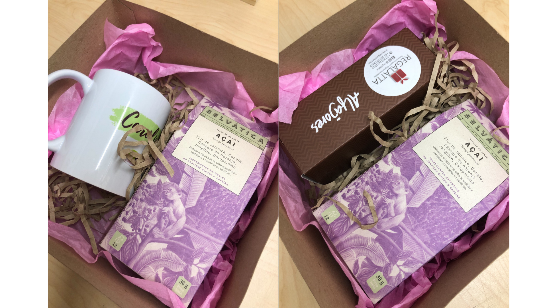 Hermosa Caja de Regalo con una taza elaborada con el diseño que escojas y media libra de café premium de exportación o caja de infusiones herbales y frutales amazónicas. Si tienes prisa, reemplaza la taza por deliciosos alfajores x 5 unidades y despertarás sensación de bienestar en tu persona especial. $95.000 Con taza O $70.000 con alfajores x5