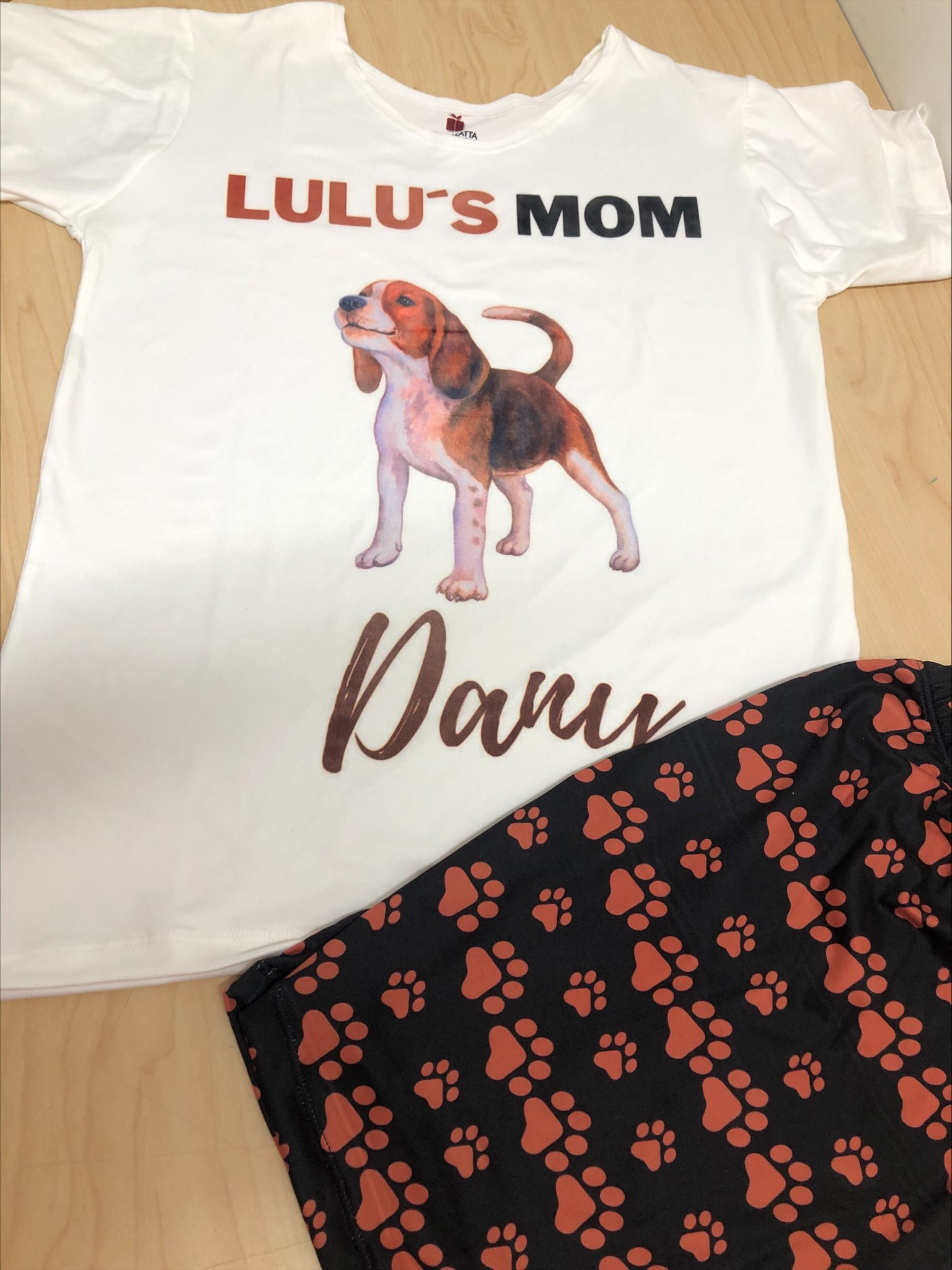 Hermosa pijama pantalón corto o largo con el motivo y nombre que desees para adulto en caja de carton de regalo y tarjeta personalizada.