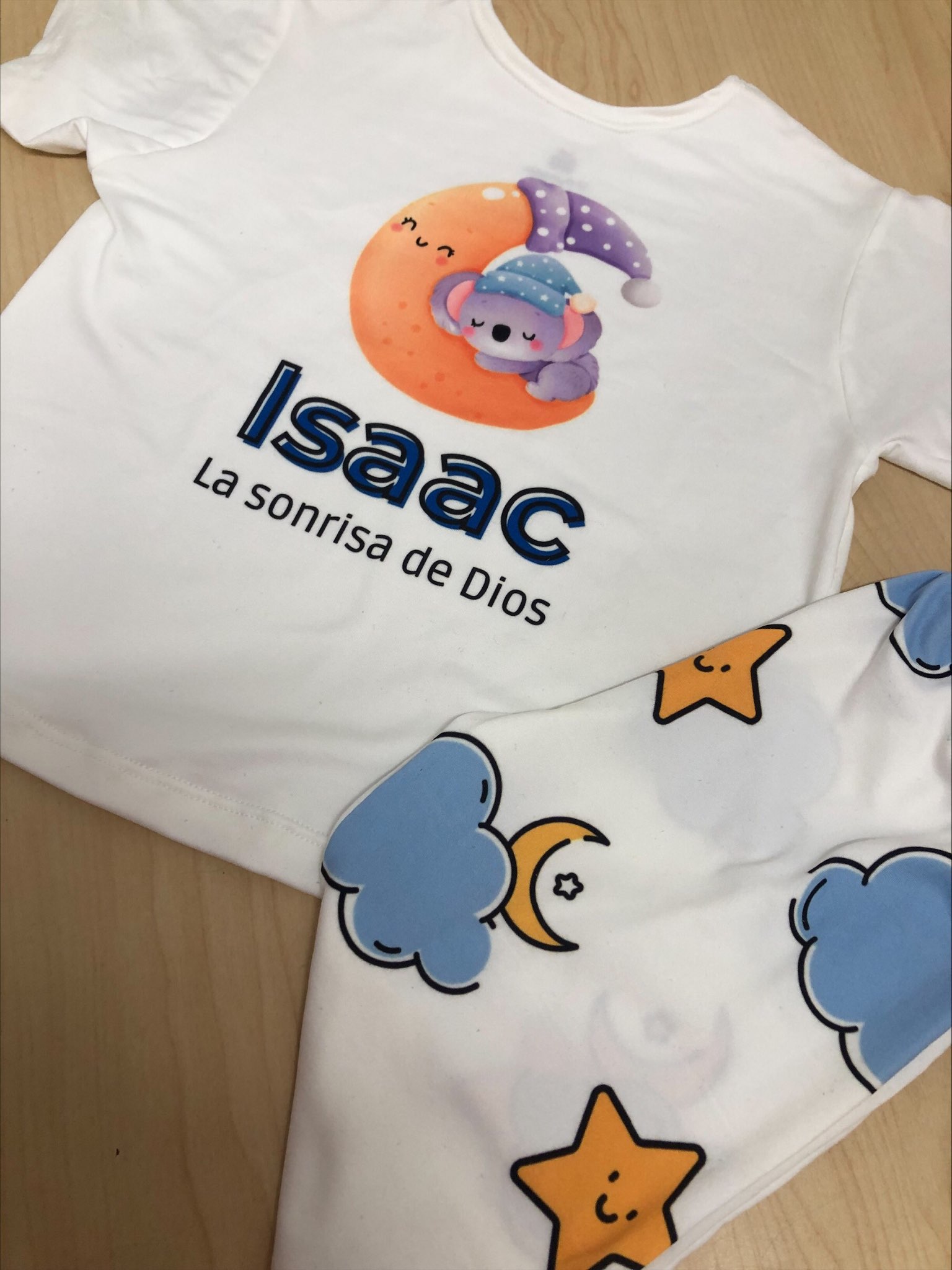 Hermosa pijama pantalón corto o largo con el motivo y nombre que desees para niño en caja de cartón de regalo y tarjeta personalizada.