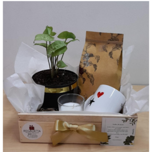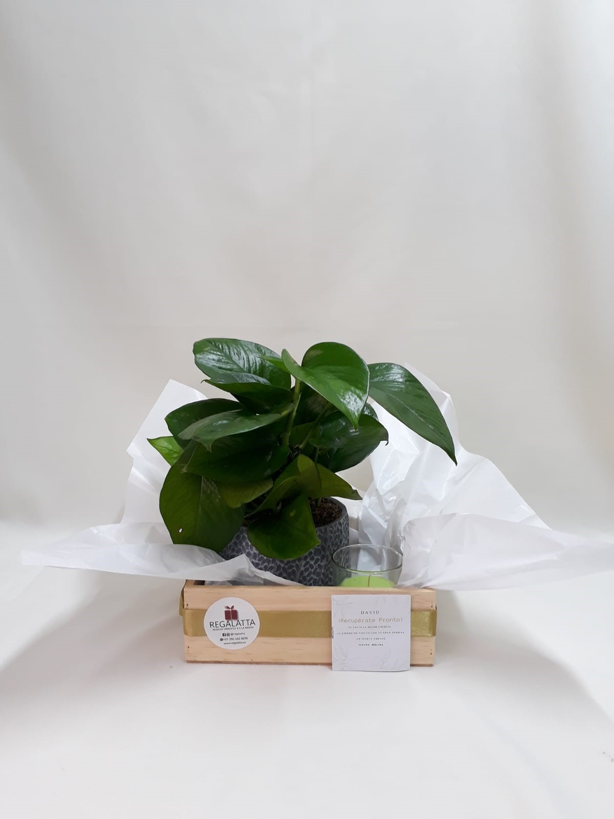 Hermosa planta en matera cerámica acompañada de una hermosa vela pequeña en envase de vidrio, presentados en una sobria caja de madera con cinta y tarjeta, precio del regalo no incluye el envío.
