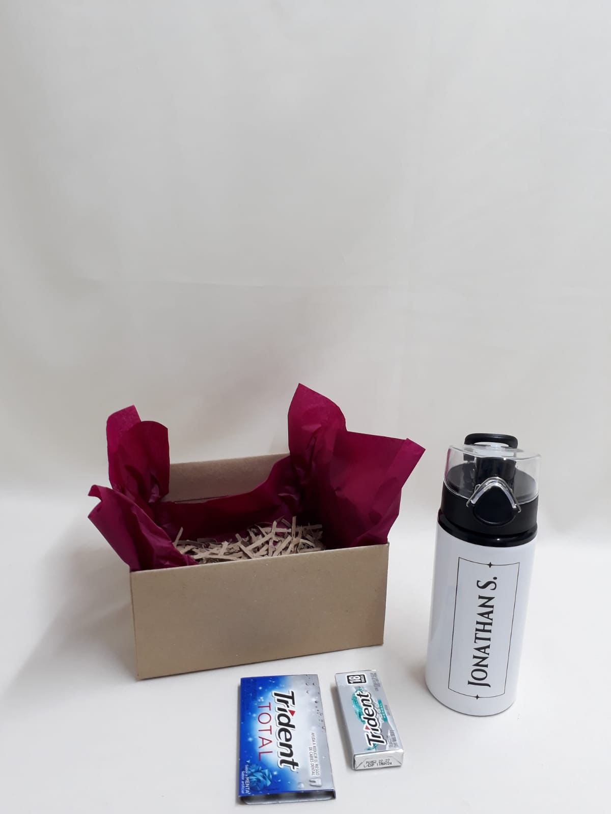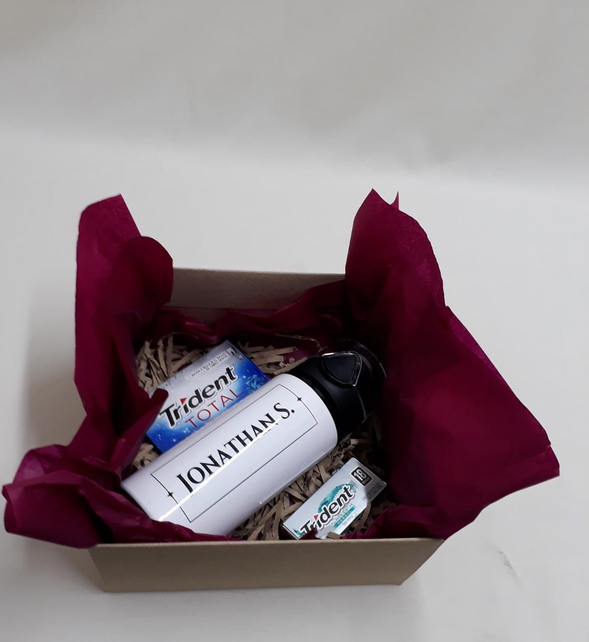 Sencillo detalle en caja kraft que incluye vaso térmico personalizado, chicles traident x 18 und, chicles trident 10 und, y tarjeta personalizada, valor no incluye el envío.