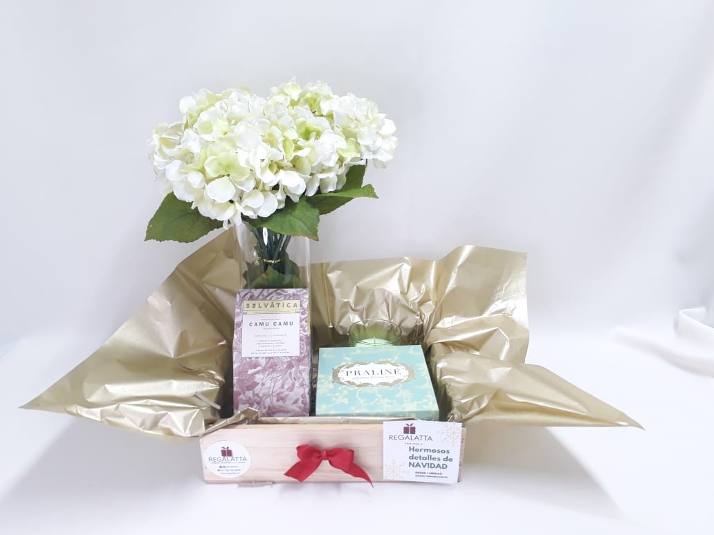 Relajante y dulce alianza con PRALINE que compone de un hermoso regalo en una Caja de madera, con una caja de Praliné que contiene 2 de postres para escoger según listado,  vela pequeña en vaso de vidrio, florero de vidrio, 24 Rosas blancas o 12 Hortensias, Infusiones herbales surtidas, moño y tarjeta personalizada. precio del regalo no incluye el envío.