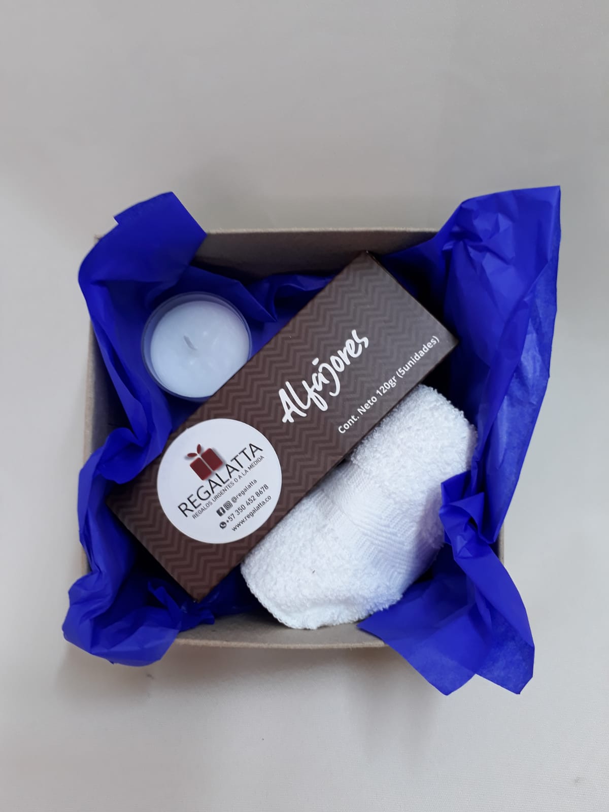 Hermoso regalito en caja de kraft con caja de alfajores x 5 unidades, toallita facial blanca, vela pequeña en vaso de vidrio y tarjeta, valor del regalito no incluye el envío.