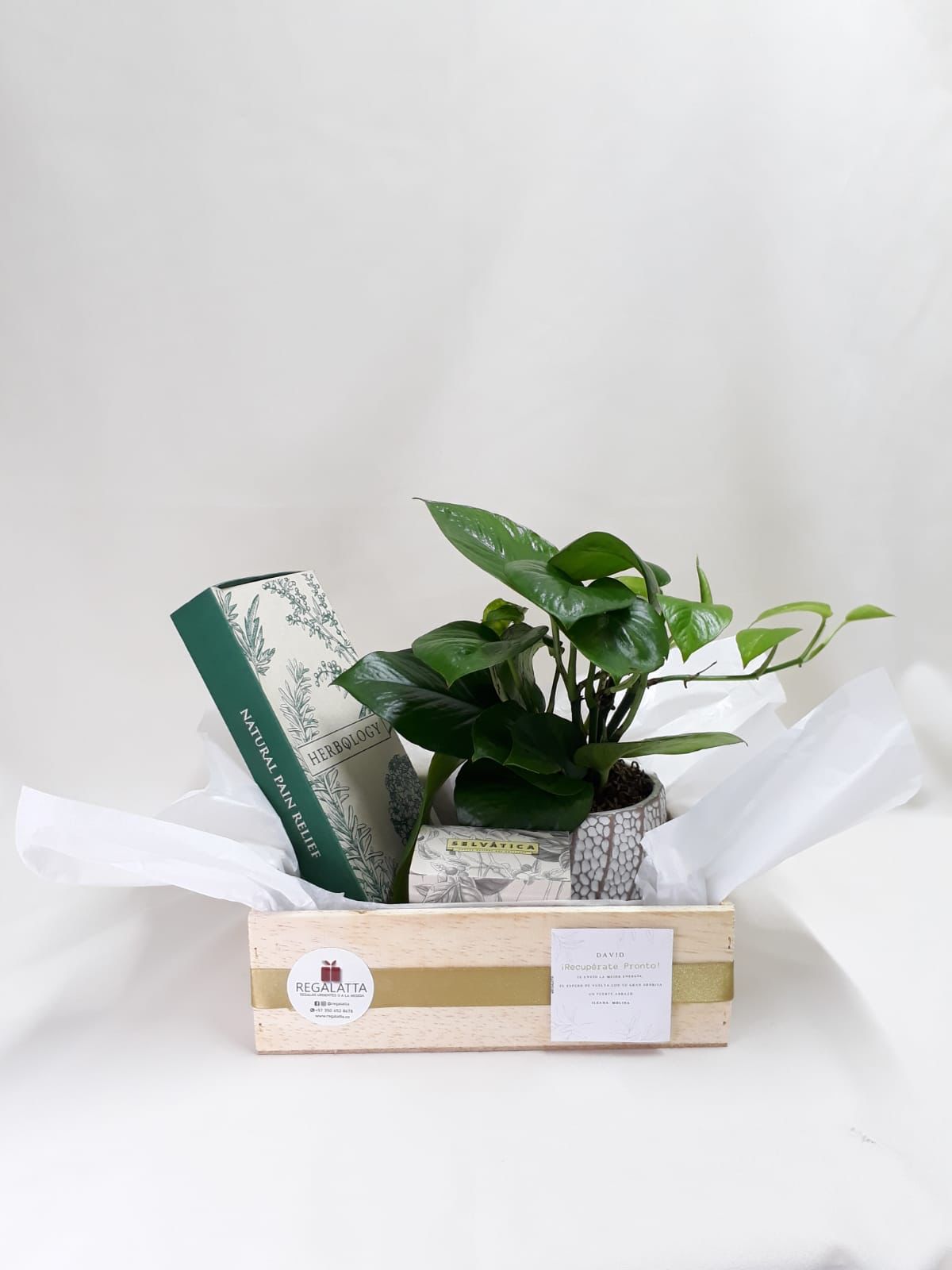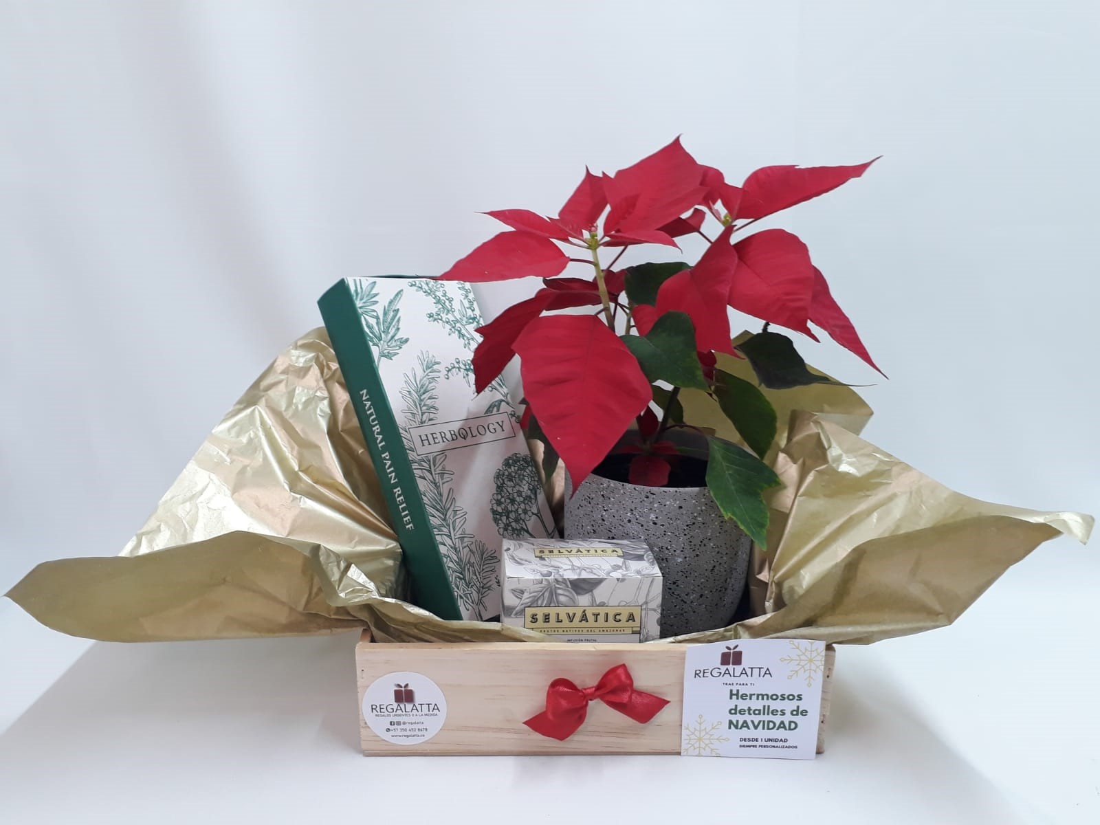 Hermoso regalo en Caja de madera, tarjeta personalizada, planta Miami verde o puedes escoger para la temporada de navidad (PLANTA NAVIDAD), matera en cerámica, Infusiones herbales (caja surtida o caja un sabor), y un relajante cojín herbal, valor del regalo no incluye el envío.