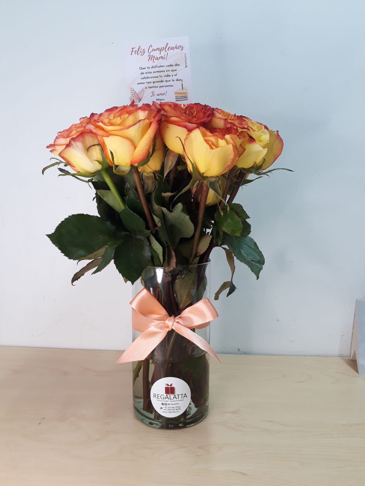 Hermoso ramo de rosas x 24 unidades en un florero de vidrio, moño en cinta de tela y su tarjeta personalizada