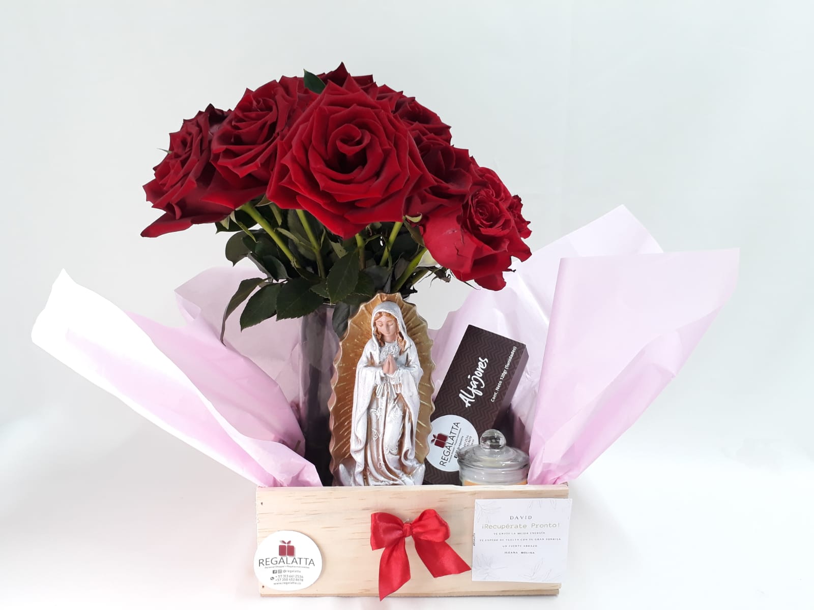 Hermoso regalo para un momento especial en caja de madera, florero con 24 rosas, virgen, vela con tapa, caja de alfajores x 5, moño, papel seda y tarjeta personalizada.