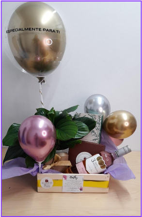 Planta de interior en matera de cerámica, acompañada de 9 alfajores premium, una botella de vino, cojín terapéutico herbal para calor o frío, globos y tarjeta personalizada, en caja de madera