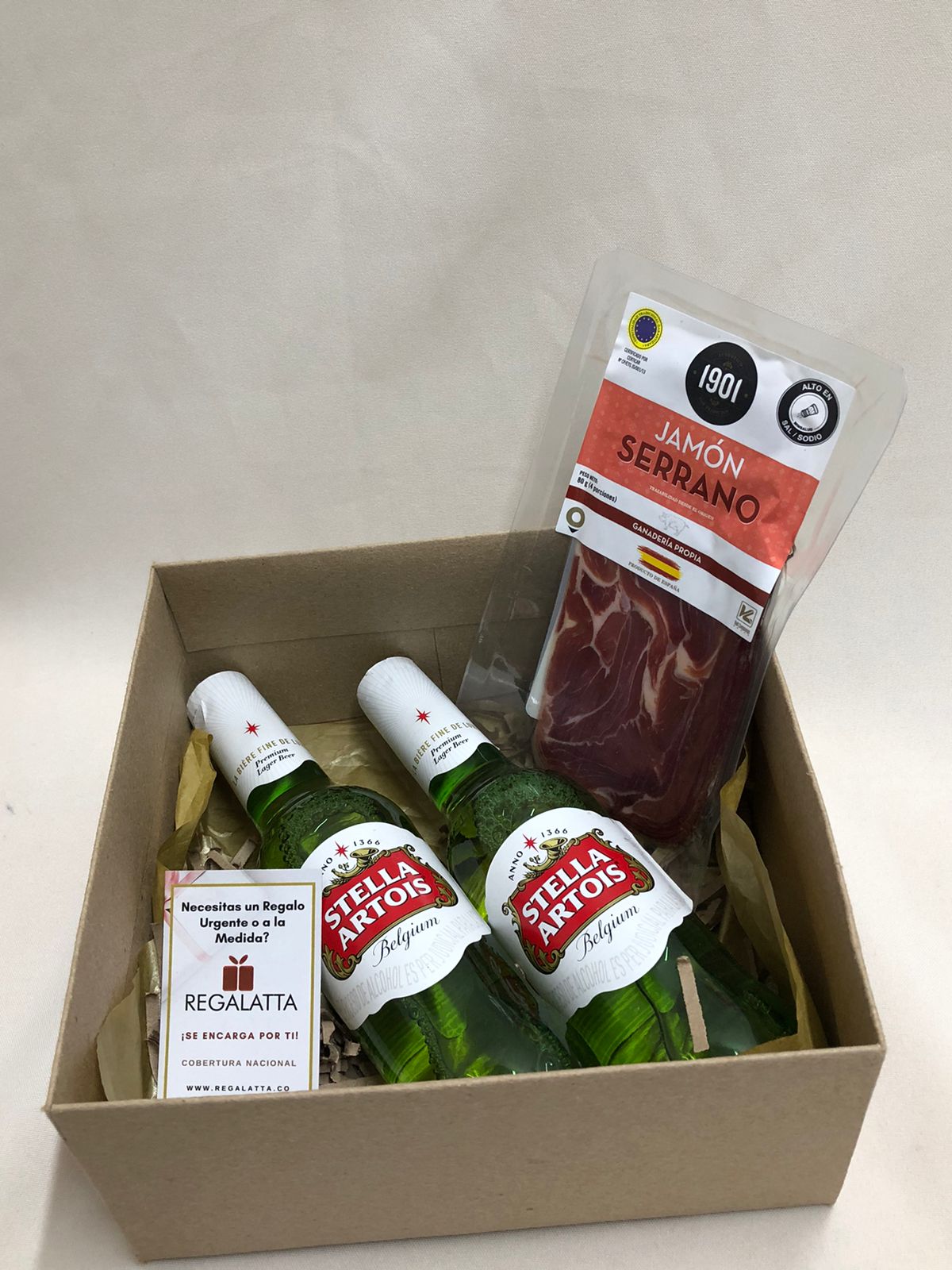 Para ese momento de celebracion este detalle lleno de sabor europeo en su Caja kraft, 2 Cervezas Stella Artois, jamón serrano y puedes ampliar la opción de chorizo español, papel seda, cinta tela, tarjeta