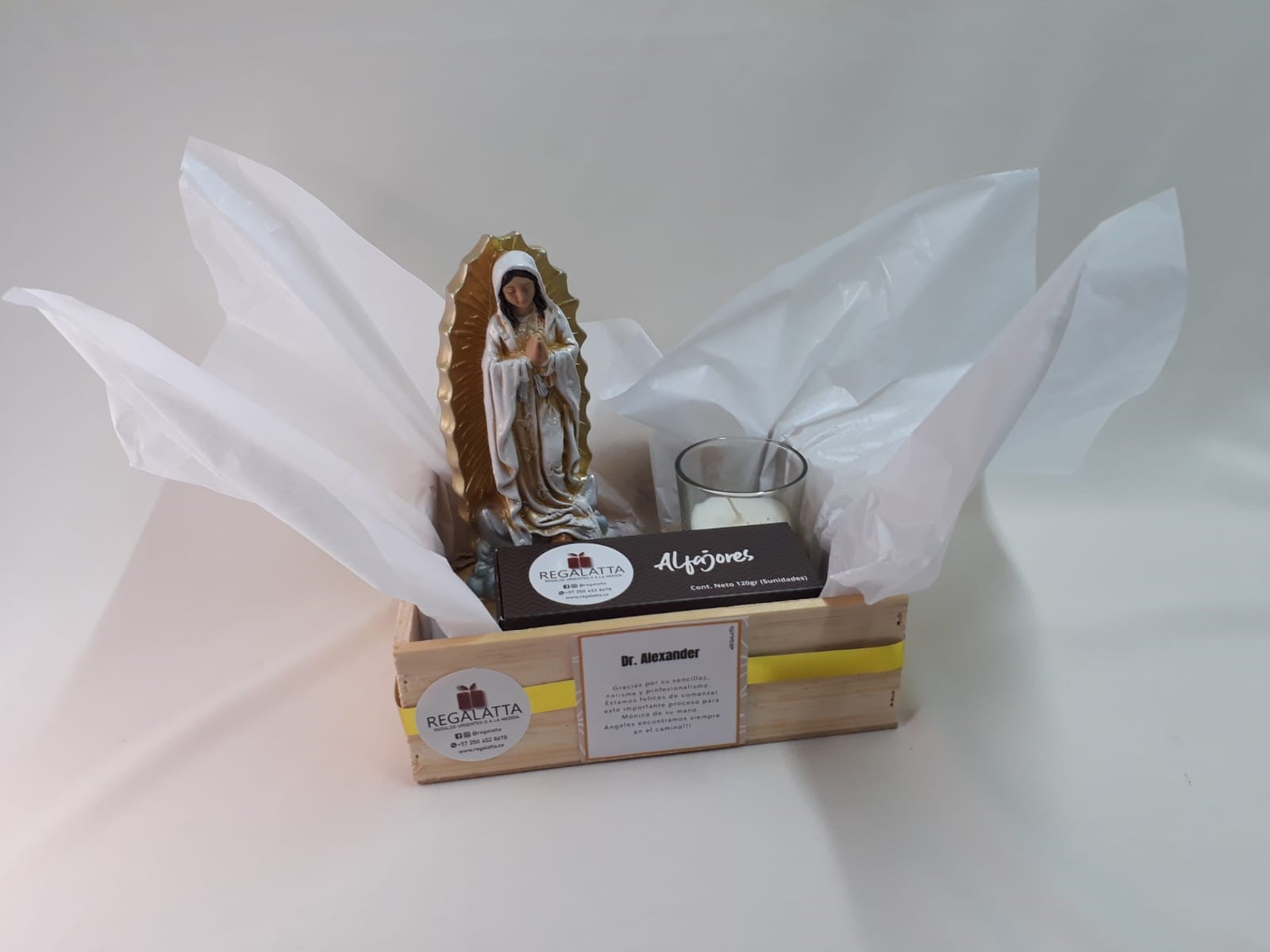 Hermosa Virgen de Guadalupe acompañada de una vela en envase de vidrio y 5 deliciosos alfajores, presentada en una sobria caja de madera decorada con cinta y tarjeta, valor no incluye envío.