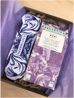Hermosa Caja de cartón de regalo que incluye antifaz terapéutico herbal para calor o frío acompañado de infusiones herbales de frutas silvestres del amazonas con moño y tarjeta, precio del regalo no incluye el envío.