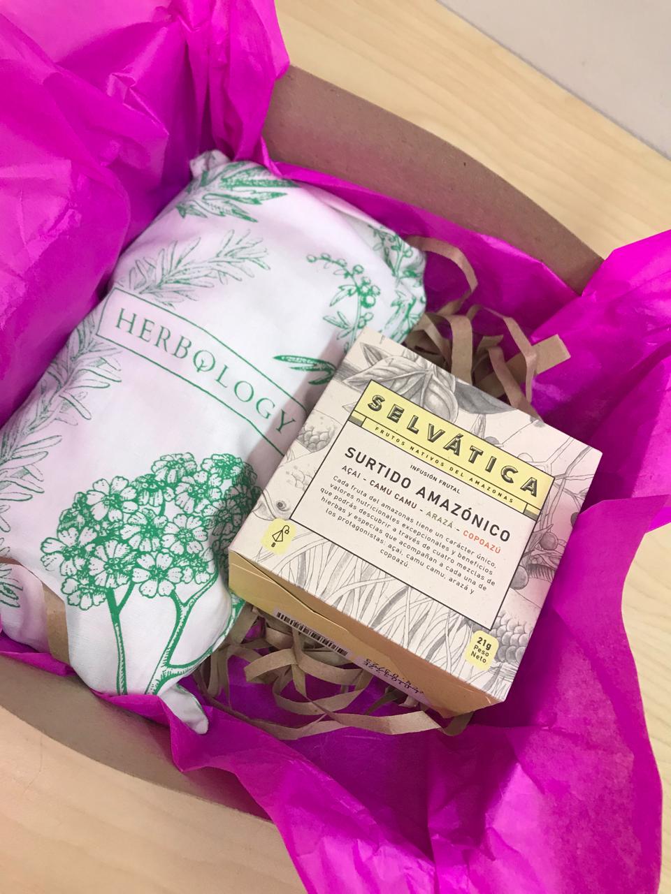 Hermosa caja de cartón de regalo que incluye cojín terapéutico herbal para calor o frío acompañado de infusiones herbales de frutas silvestres del amazonas con moño y tarjeta, precio no incluye envío.