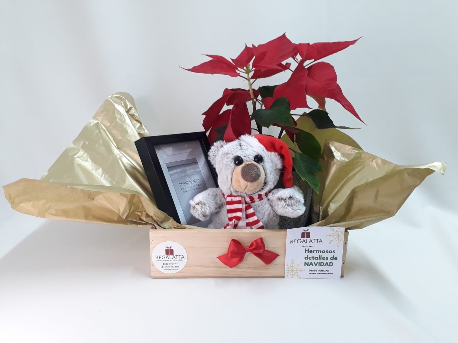 Hermoso regalo de navidad en Caja de madera, papel seda, moño de tela, tarjeta personalizada, planta navidad, matera en cerámica, portarretrato de 15.2 cm x 10.2 cm, osito de peluche de 20 cm, valor de regalo no incluye envío.