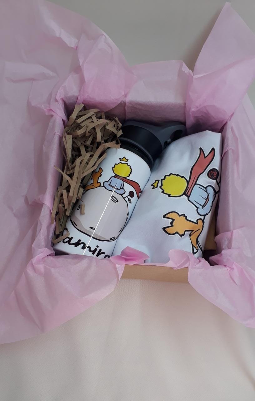 Especial detalle empacado en caja kraft que contiene Termo de 600ml personalizado, camiseta estampada personalizada, tarjeta y moño en cinta de tela, valor no incluye envío.