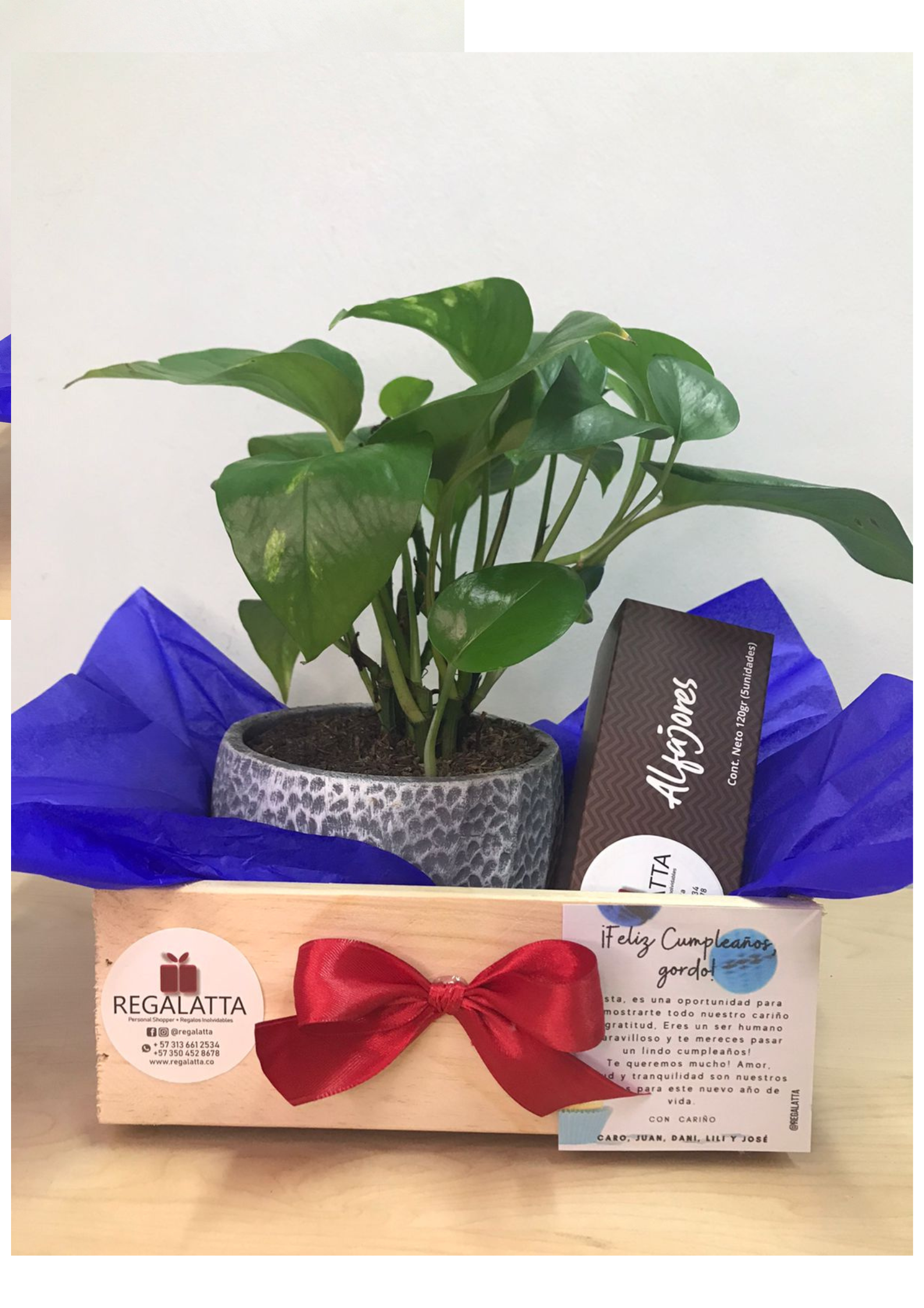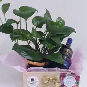 Hermosa planta en matera cerámica acompañada de deliciosos alfajores x5 presentados en una sobria caja de madera con cinta y tarjeta, precio del regalo no incluye el envío.