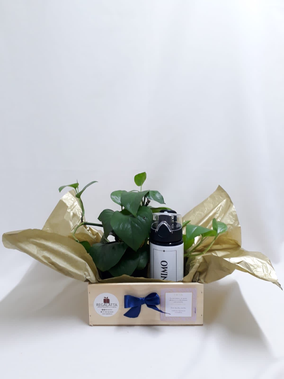 Especial detalle en caja de madera que contiene un termo personalizado, hermosa planta Miami verde en matera plástica y puedes elegir la opción con matera en cerámica, tarjeta personalizada, valor no incluye envío.